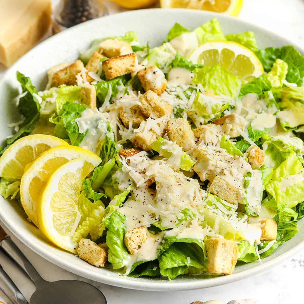 میکس کاهو، مرغ گریل، پنیر پارمسان، کروتان (نان سیر)، سس سزار، زیتون